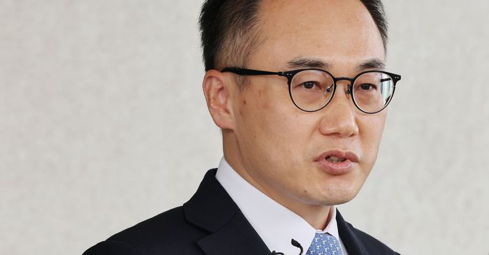 윤석열 정부의 첫 검찰총장 후보자로 지명된 이원석 대검 차장검사가 지난달 18일 서울 서초구 대검 현관 앞에서 소감을 밝히고 있다. 연합뉴스