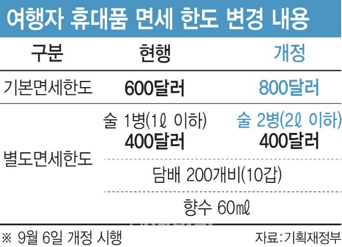 기본 면세 한도는 현행 600달러에서 800달러로 인상된다. 별도 면세 한도 중 술에 대한 한도는 현행 1리터(L) 이하 1병에서 2리터 이하 2병으로 확대된다. 담배는 200개비(1갑), 향수는 60㎖ 한도가 그대로 유지된다.