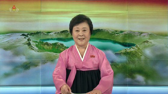 북한 조선중앙TV에 출연해 김정은 국무위원장의 공개활동을 전하는 이춘히 아나운서 모습. [연합뉴스] |
