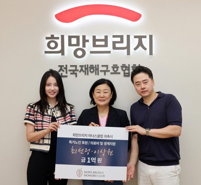 함께 공개된 사진에는 최선정이 희망브리지에 독거노인에게 의료비 및 생계지원을 위해 남편 이상원과 함께 1억원을 기부해 고액 기부자 모임에 가입하게 된 모습이 담겼다.