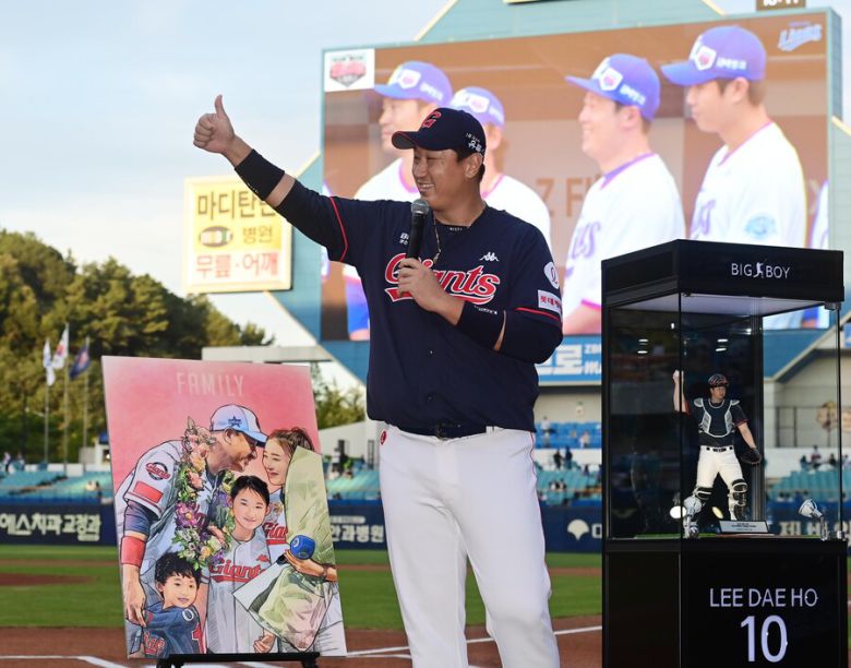 선물 전달에는 오승환이 나섰다. 삼성은 이대호와 그의 가족에게 아트 디렉터 '광작가'가 이대호 가족 사진 일러스트 액자를 선물했다. 이어 강민호와 박진만 감독 대행이 이대호에게 꽃다발을 전달했다.