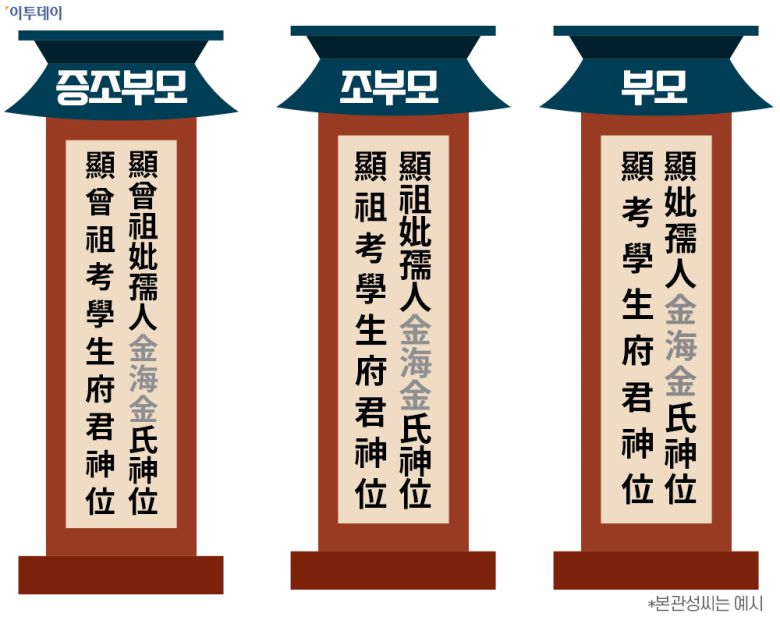예를 들어 아버지를 기리는 제사나 차례를 지내면 우리가 한 번쯤은 들어봤을 법한 ‘현고학생부군신위’(顯考學生府君神位), 어머니의 경우 ‘현비유인○○○씨신위’(顯妣孺人○○○氏神位)라고 쓰면 된다.