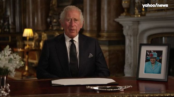 영국의 새 국왕인 찰스 3세가 9일(현지시간) 첫 TV 대국민 연설에서 발언하고 있다. (출처=야후뉴스)