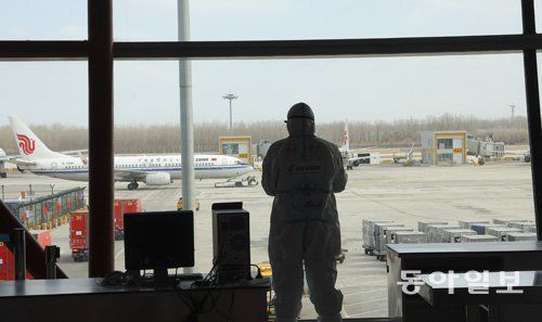 베이징 공항에 방역복을 입은 관계자가 서 있다. 원대연 기자 yeon72@donga.com |