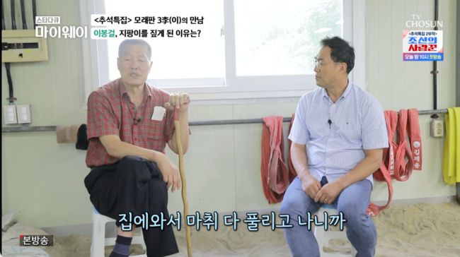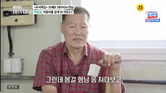 끝으로 이만기가 등장했고 모두 오랜만이라며 악수를 했다. 이봉걸은 본인의 지팡이를 보고 “명절에 대회 끝나고 몸이 피곤하길래 등 마사지를 받았다. 마사지 받고 일어나려고 하는데 누가 주먹 하나를 툭 치는 느낌이 드는 거다”라고 설명했다.
