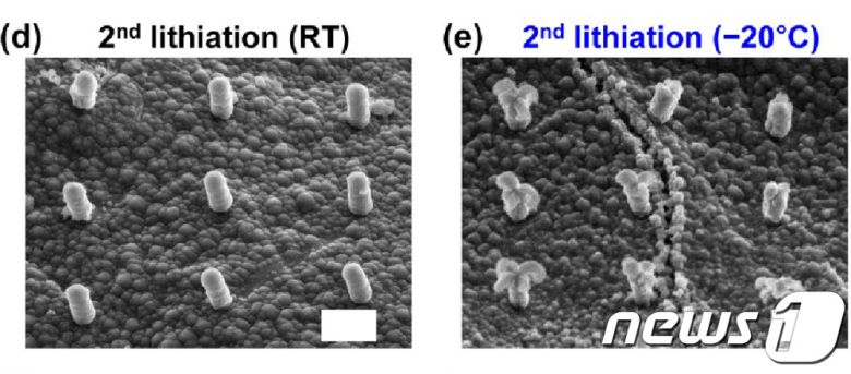 연구팀은 영하 20℃ 이하의 저온 환경에서 리튬 충‧방전을 거친 실리콘 나노 기둥의 파괴 거동도 분석했다. 그러자 상온에서는 리튬 이온을 두 번 충전해도 비교적 안정적이었던 300나노미터(㎚) 지름의 실리콘 나노 기둥이 저온 환경에서는 100% 파괴됐다.