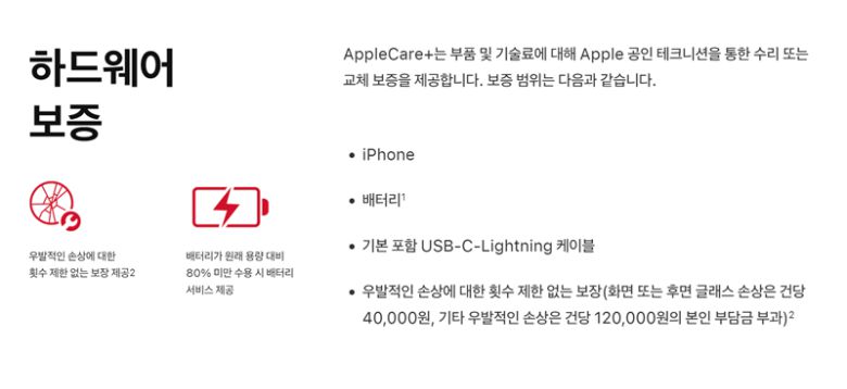 애플케어 플러스는 애플 제품의 무상 보증기간을 늘려주고, 우발적 손상에 대한 수리비도 대폭 감면해주는 유상 서비스다. 아이폰 13 기준 화면 손상을 수리하는 데 37만 8000원이 청구되지만, 애플케어 플러스 가입자에게는 4만 원의 본인 부담금만 청구된다.