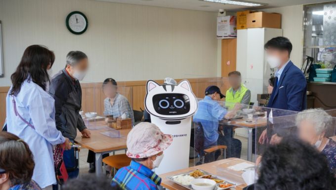 고양고양이 형태의 서빙로봇이 복지관을 돌고 있다/사진제공=브이디컴퍼니 |