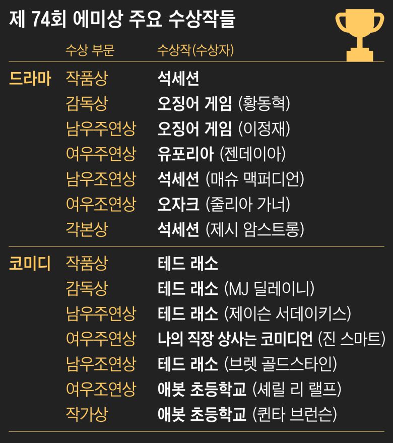 드라마 부문 여우주연상, 여우 조연상은 각각 약물과 트라우마 등으로 방황하는 10대 청소년들의 이야기 ‘유포리아(HBO)’에서 여주인공을 연기한 젠데이아, 마약 조직과 얽힌 가족을 그린 스릴러 드라마 오자크(넷플릭스)에서 열연한 줄리아 가너에게 돌아갔다. 줄리아 가너는 특히 같은 작품으로 2019년(71회)·2020년(72회)에 이어 에미상 드라마 여우조연상 3관왕을 달성하게 됐다.