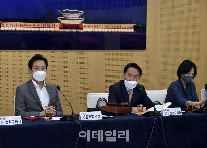 [이데일리 김태형 기자] 이성헌(가운데) 서울시구청장협의회장(서대문구청장)이 14일 서울시청에서 열린 서울시구청장협의회에서 제172차 협의회 정기회의를 진행하고 있다.