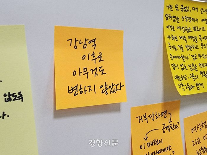 “나는 또 죽었고, 다시 살아남아 포스트잇을 붙인다. 일터였던 신당역에서 여성노동자가 죽었다. 이것은 여성혐오 범죄이고 산업재해다. 사회는 계속 여성을 죽이고 여성이 죽는 것, 여성을 죽이는 것을 방관하고 묵인한다. 도대체 몇 명이 더 죽어야 할까.”