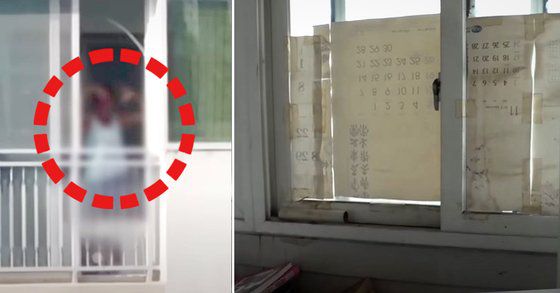 아파트 발코니에서 음란행위를 한 60대 남성(왼쪽) 때문에 맞은편 주민들은 창문에 종이를 붙이는 등 밖을 내다볼 수 없는 괴롭힘을 당했다. 사진 SBS 캡처 |