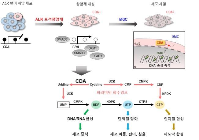 연구팀은 표적항암제를 투여할 때 암 세포 증식·이동성을 높여 전이를 유발하는 ‘시티딘 탈아미노효소’(CDA)가 암세포 내에서 활성화해 항암제를 회피하고 증식하면서 내성이 생긴다는 것이다.