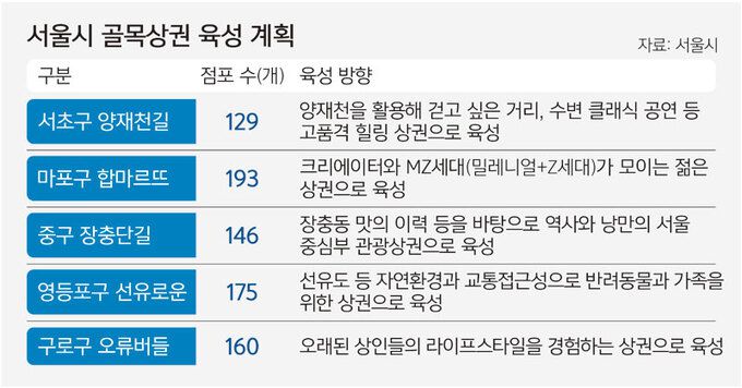 서울시는 △양재천길(서초구) △합마르뜨(마포구) △장충단길(중구) △선유로운(영등포구) △오류버들(구로구) 5곳을 로컬브랜드 상권으로 선정하고 이달부터 3년간 집중 육성하겠다고 20일 밝혔다. 상권별로 최대 30억원의 예산과 각종 시설, 인프라, 콘텐츠를 집중 투입해 명소화 작업에 나선다.