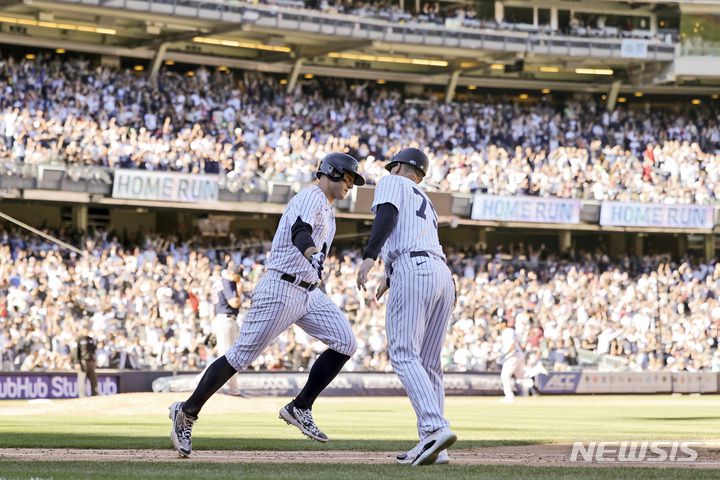 [뉴욕=AP/뉴시스] 뉴욕 양키스의 앤서리 리조(왼쪽)가 25일(한국시간) 미국 뉴욕 브롱크스 양키 스타디움에서 열린 보스턴 레드삭스와 2022 MLB 홈경기에서 7회 말 투런홈런을 친 뒤 1루 주루코치 트래비스 채프먼의 축하를 받고 있다. 2022.09.25. |