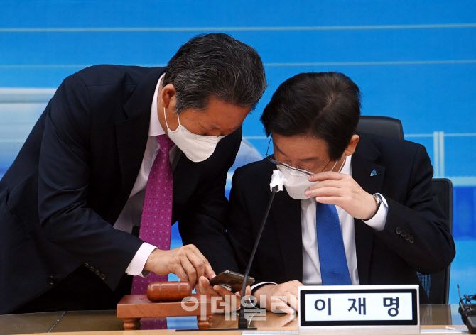 [국회사진취재단] 이재명 더불어민주당 대표와 정청래 최고위원이 26일 경기도청 재난안전상황실에서 열린 더불어민주당 현장 최고위원회의에서 정 최고위원의 핸드폰을 함께 보고 있다.