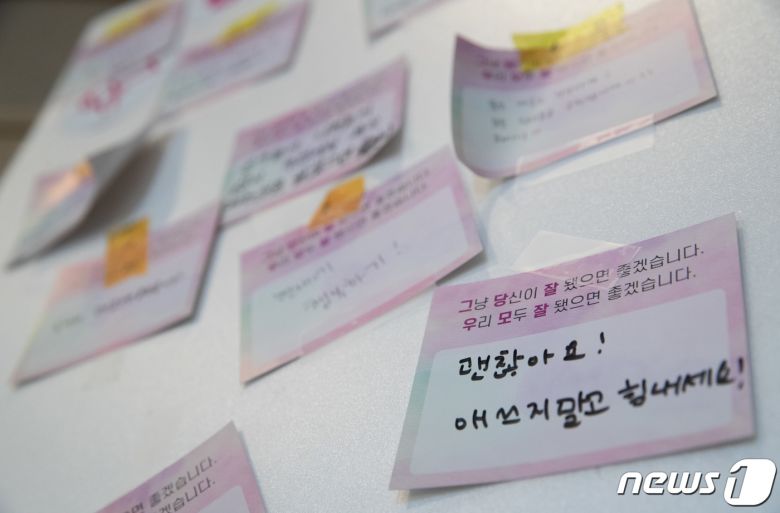 23일 오후 서울 동작구 서울여성플라자에서 서울시자살예방센터 주최로 열린 ‘서울 청년의 생명을 살려라’ 100인 토론회에서 참가자들이 적어 놓은 응원의 메시지가 붙어 있다. 2022.8.23/뉴스1 ⓒ News1 이재명 기자 |