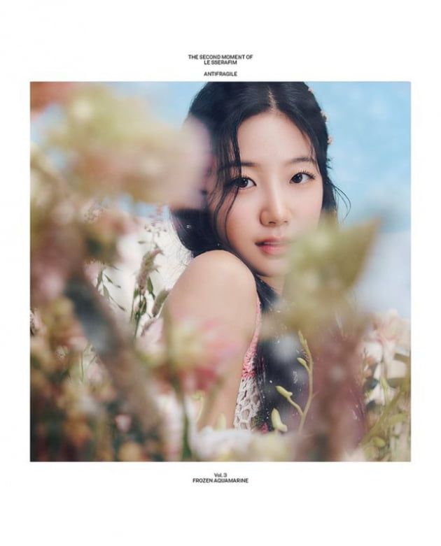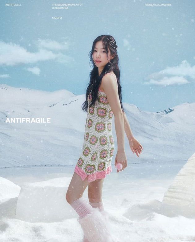 카즈하는 27일 르세라핌 공식 인스타그램에 '안티프래자일(ANTIFRAGILE)' 첫 번째 컨셉트 '프로즌 아쿠아마린(FROZEN AQUAMARINE)' 글과 함께 사진을 게재했다