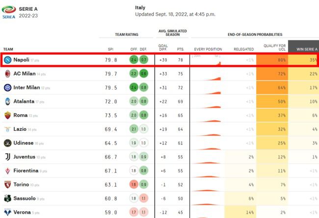 미국 데이터 전문 매체 '파이브 서티 에잇'은 지난 19일(한국시간) 2022-23시즌 이탈리아 세리에A 최종 순위 예측 결과를 업데이트했다.