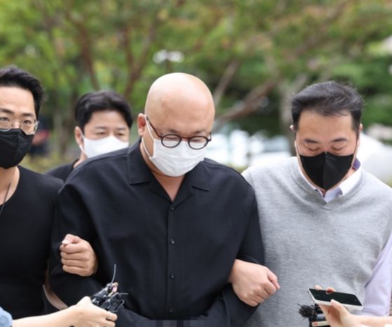 (서울=연합뉴스) 황광모 기자 = 마약 투약 혐의를 받는 유명 작곡가겸 사업가인 돈스파이크(본명 김민수)가 28일 오전 구속 전 피의자 심문(영장실질심사)을 받기 위해 서울 도봉구 서울북부지법에 출두하고 있다. 2022.9.28 hkmpooh@yna.co.kr 〈사진=연합뉴스〉