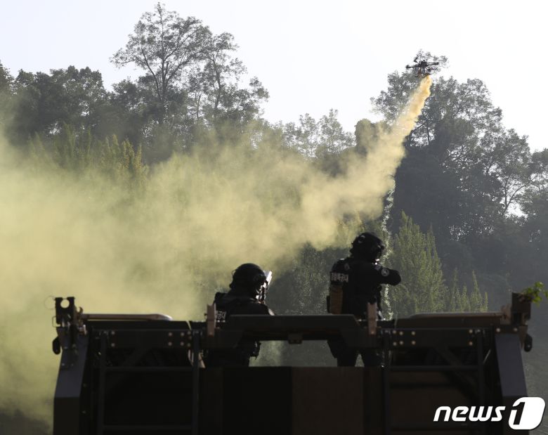 (서울=뉴스1) 신웅수 기자 = 29일 오후 서울 서초구 경찰특공대에서 드론이 폭발물을 탑재한 상황을 가정한 대테러 관계기관 합동 훈련이 진행되고 있다. 이번 훈련은 테러 발생 시 단계별 조치 방법을 숙달하고 기관별 효율적 대응체계 확립을 강화하기 위해 마련됐다. 2022.9.29/뉴스1