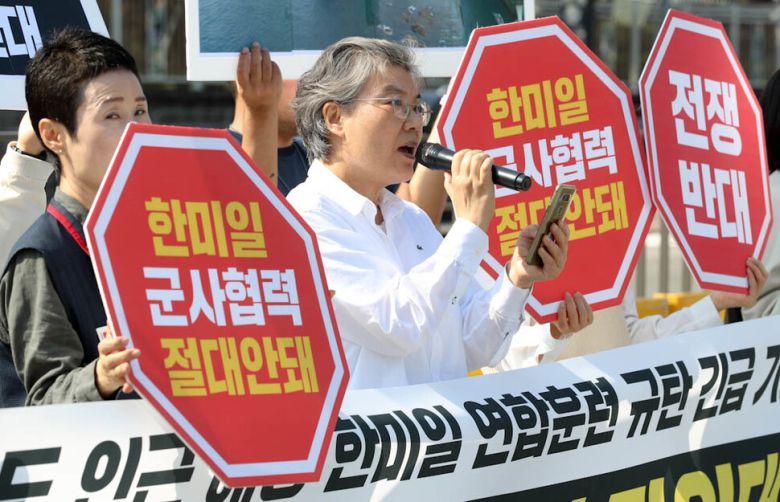 평화운동 시민단체 겨레하나가 30일 오전 서울 용산 대통령실 앞에서 기자회견을 열어 이날 한미 양국 해군이 동해 공해상에서 일본 해상자위대와 함께 군사훈련을 하는 것에 반대한다고 밝혔다. 이들은 훈련 장소가 독도와 불과 150여㎞ 떨어진 곳으로 알려졌다며 “일본을 독도 앞바다로 불러들이는 것은 영토를 강탈하려는 의도가 명확한 적국에 안마당을 내어준 것이나 다름없다”고 주장했다. 또한 “한미일 3국의 연합군사훈련은 유사시 일본 자위대의 한반도 개입을 불러올 것”이라며 과거사 해결 없이 한-일 군사협력을 추진하는 정부를 규탄하고 군사훈련 중단을 촉구했다.