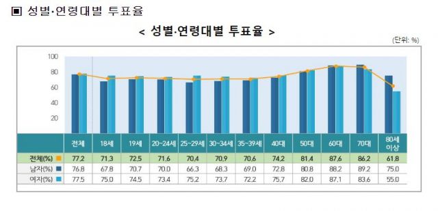 남성 투표율이 높게 나타난 60대 이상 여성·남성 간 투표율 차이를 보면, △ 80세 이상 -20%포인트(여 55%, 남 75%) △ 70대 -5.6%포인트(여 83.6%, 남 89.2%) △ 60대 -1.1%포인트(여 87.1%, 남 88.2%) 등이다.