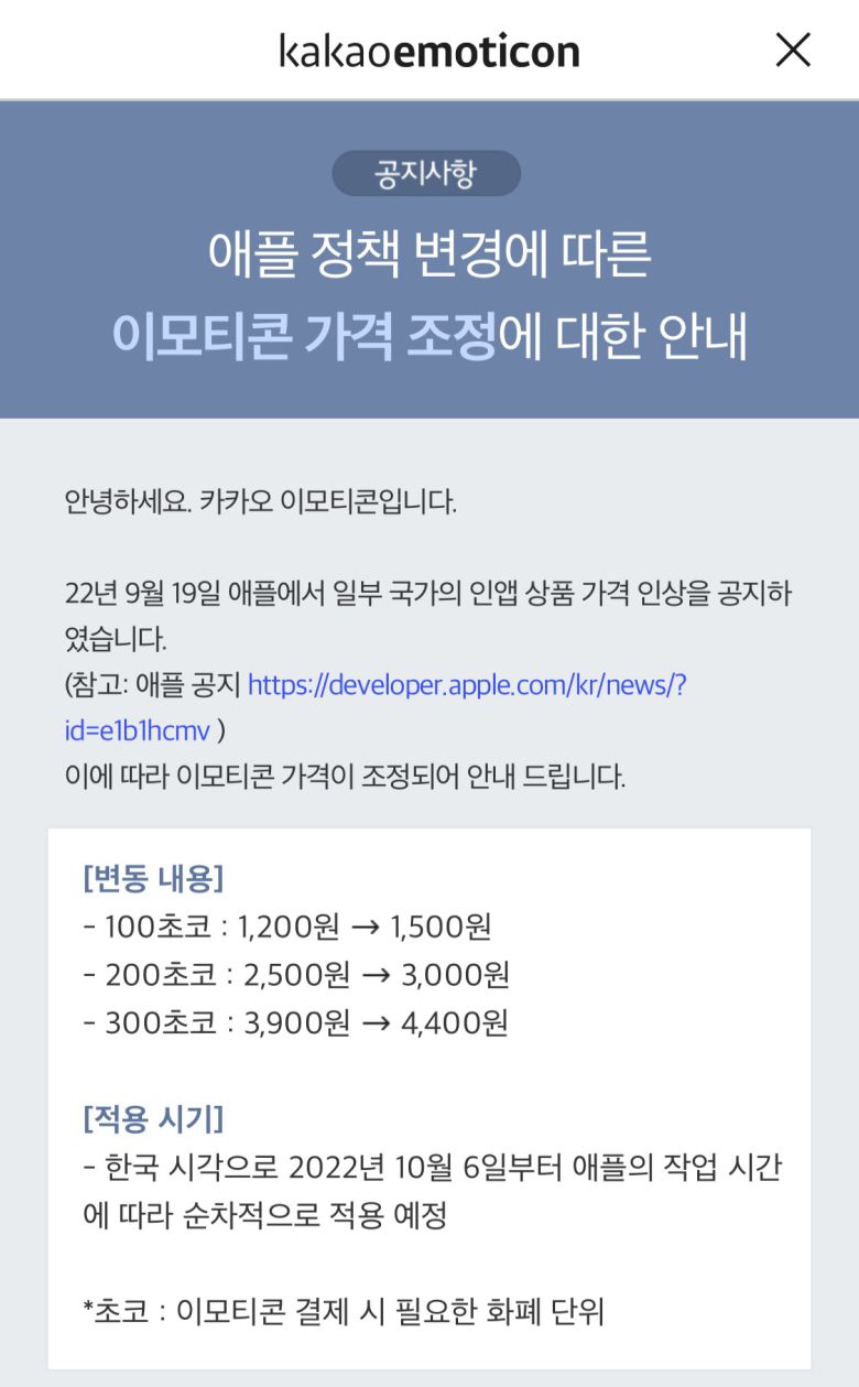 "애플 정책 변경에 따른 이모티콘 가격 조정"