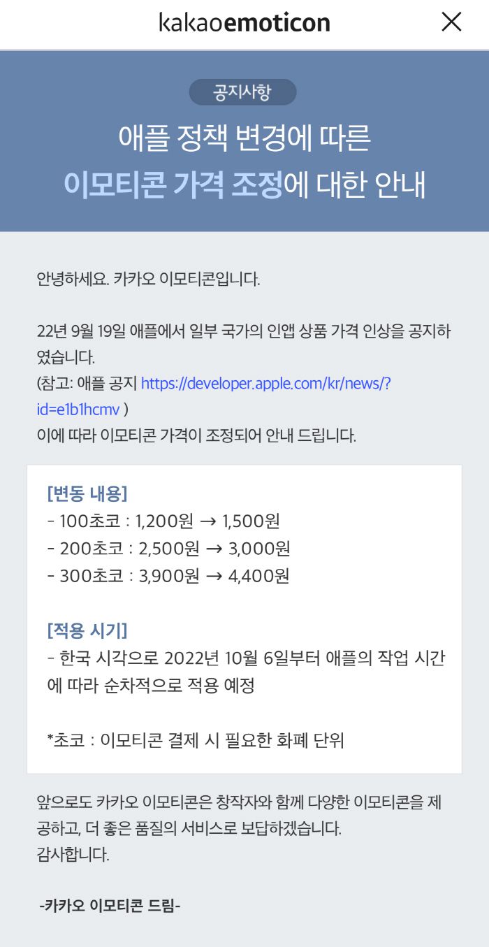 이에 따라 이모티콘 결제용 화폐인 '초코' 100개 가격이 기존 1200원에서 1500원으로 오른다. 200개는 2500원에서 3000원, 300개는 3900원에서 4400원이 된다.