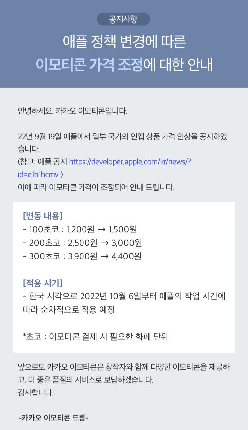카카오는 이번 이모티콘 인상 조치가 지난 19일 애플이 일부 국가 대상으로 인앱 상품 가격 인상 공지에 따른 것이라는 설명이다. 가격 인상은 오는 6일부터 애플의 작업 시간에 따라 순차적으로 적용될 예정이다.