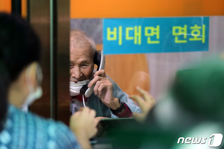 대면 면회에서 비대면 면회로 전환된 25일 오전 광주 북구 한 요양병원에서 입소자 가족들이 면회를 하고 있다. 2022.7.25/뉴스1 ⓒ News1 정다움 기자 |