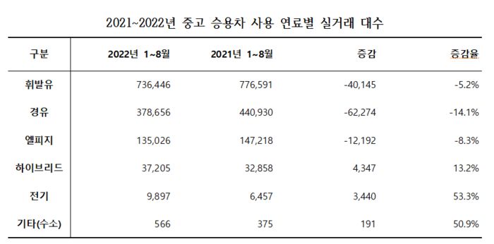 2021~2022년 중고 승용차 연료별 거래 대수  출처 : 카이즈유데이터 연구소