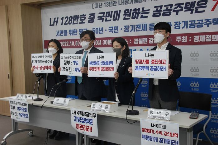 이어 “윤석열 정부는 강제수용 땅장사 중단하고 저렴한 임대료 20년 이상 거주 가능한 진짜 공공주택 공급하라”고 주장했다. 또 10년주택·행복주택 등 단기임대 중단하고, 매입임대 취득실태 등을 철저히 조사할 것을 요구했다. 공공주택사업 민간참여 중단도 요구했다.