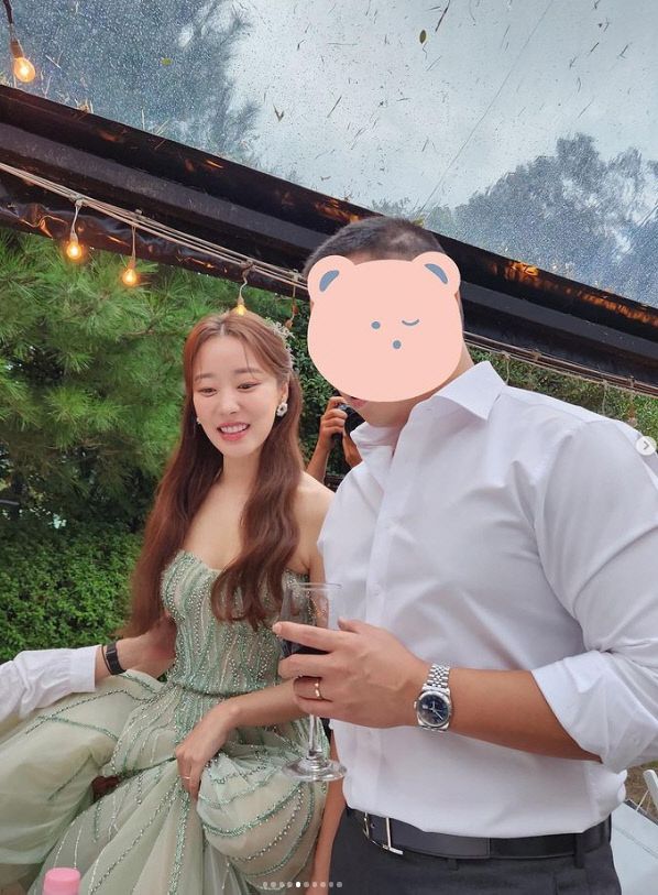 이어진 피로연 사진에서는 연녹색 드레스를 바꿔입은 고우리가 우람한 팔뚝을 자랑하는 와이셔츠 차림의 남편과 와인잔을 든채 하객인사를 하고 있다.