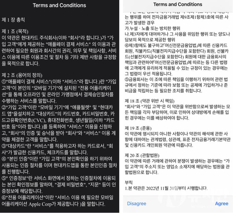 이날 유출된 약관에는 ‘현대카드 주식회사가 가입고객에게 제공하는 애플페이 결제서비스’라는 내용이 담겼다. ‘애플페이 결제 서비스’의 정의도 설명됐다. 본문에는 ‘본인의 모바일 기기에 설치된 전용 애플리케이션(앱)을 통해 오프라인 및 온라인 가맹점에서 결제승인 절차를 수행하는 서비스’로 표기됐다.