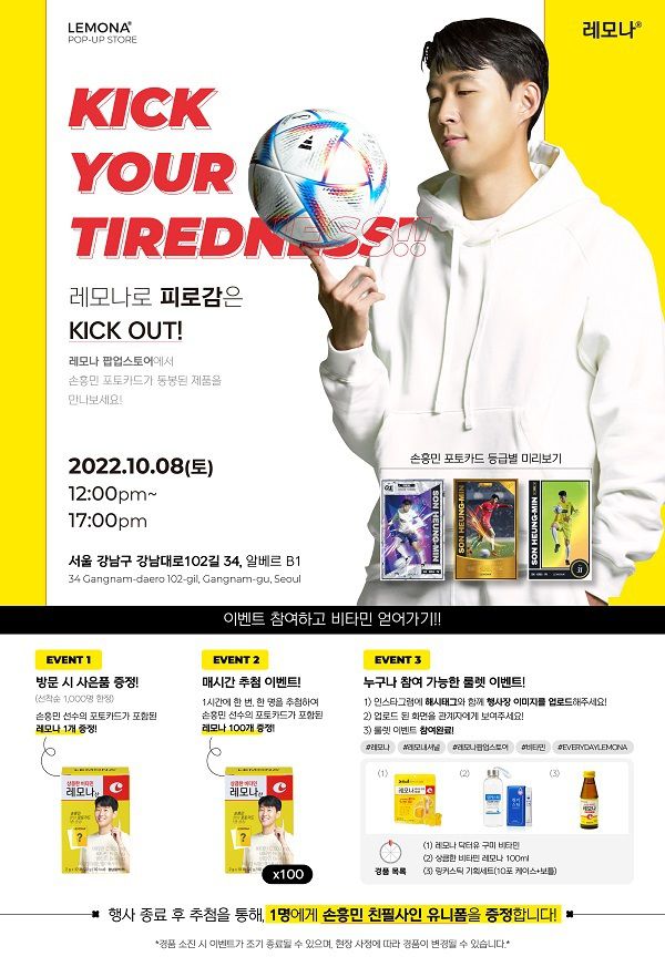 방문객에게는 선착순 1000명에 한해 손흥민 선수의 포토카드가 포함된 상큼한 비타민 레모나산 1개를 증정한다. 또 1시간에 한 번, 한 명씩 추첨을 통해 레모나X포토카드 제품 100개를 증정한다.