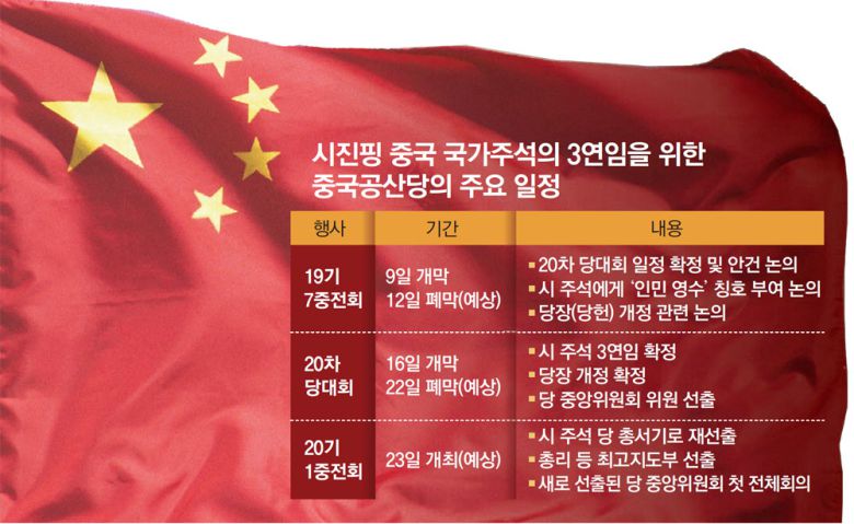 7중전회에 이어 열리는 20차 당대회는 개막일은 정해졌지만 폐막일이 정해지지 않았다. 18, 19차의 전례에 비춰 볼 때 7일간 개최될 것으로 예상되며 이 경우 22일 폐막하게 된다. 당 대회 폐막일에는 새로 선출된 공산당 중앙위원 명단이 공개된다. 공산당의 확대 지도부 격인 중앙위원 명단을 통해 지도부에서 퇴장할 사람과 새롭게 진입할 사람들이 개략적으로 드러난다.