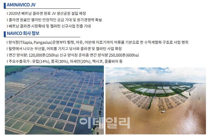 아미코젠은 지난해 베트남에서 메기 양식장을 운영하고 있는 ‘니비코’(NIVICO)와 합작투자법인(아미나비코) 설립으로 안정적인 원료 공급처를 확보했다. 여기에 800톤 규모의 콜라겐 원료인 젤라틴 생산공장을 건립했다. 아미코젠은 지난 7월 식약처에 메기 콜라겐에 대해 개별인정형 원료 허가 신청을 했다.