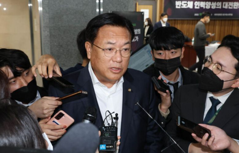 정진석 국민의힘 비상대책위원장이 11일 서울 여의도 국회 의원회관에서 열린 '반도체 인력양성의 대전환! 강원도가 시작합니다' 토론회에서 축사를 마친 뒤 취재진의 질문에 답변하고 있다. 공동 취재사진