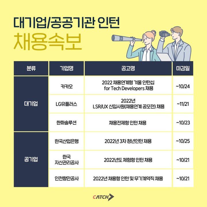 [서울=뉴시스]이현주 기자 = 대기업과 공공기관에서 실무 경험을 쌓을 수 있는 인턴 채용이 한창이다. 대기업 주요 기업으로는 카카오, LG유플러스, 한화솔루션이 있고, 공공기관 주요 기업으로는 한국산업은행, 한국자산관리공사, 인천항만공사가 있다.