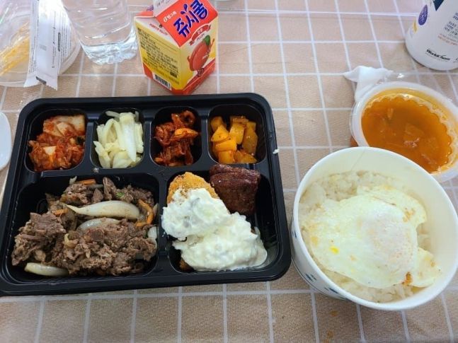공개된 사진에는 반찬으로 불고기, 생선가스, 떡갈비, 감자채볶음에 김치류 3종이 식판 가득 담겨 있었다. 여기에 계란 프라이 한 장이 고스란히 덮힌 흰 밥과 김치찌개, 디저트로 음료수까지 푸짐하게 제공됐다.