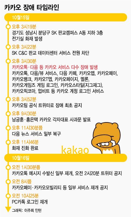 카카오와 네이버(NAVER) 등이 사용하는 경기도 성남시 판교SK C&C 데이터센터 전기실에서 지난 15일 오후 3시19분쯤 화재가 발생했다. 3분 후에는 전원이 차단됐고, 이때부터 카톡을 비롯한 카카오의 대부분 서비스와 네이버 일부 서비스에 장애가 발생했다.