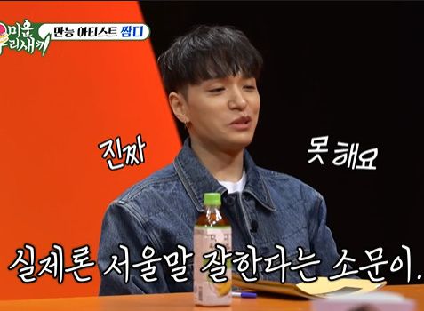 이에 신동엽은 "독보적이라 밥줄이 끊길까봐 일부러 사투리쓴다는 얘기도 있다, 실제론 서울말 잘한다던데?"라며 질문, 쌈디는 "고치려 해본 적도 없고 안 고쳐지더라 밥줄 끊기기 싫어 일부러 더 쓴다"며 웃음 지었다.