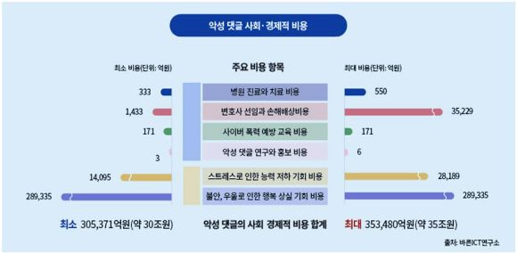 연구소는 이 모델을 적용한 결과, 악성 댓글로 인한 우리나라의 사회·경제적 비용은 연간 최소 30조원, 최대 35조원에 달한다고 분석했다.