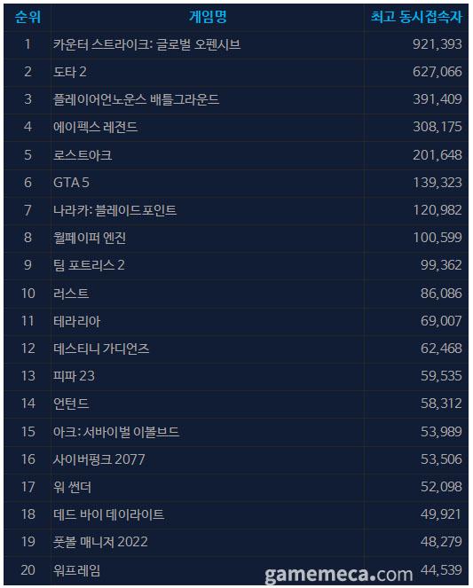 일 최고 동시접속자 TOP 20에서는 중하위권의 동시접속자 수가 전반적으로 감소한 가운데, 사이버펑크 2077의 최대 동시접속자 수가 약 2만여 명가량 줄어들어 16위로 하락했다. 이어 데드 바이 데이라이트 순위도 18위로 3단계 내려갔다.