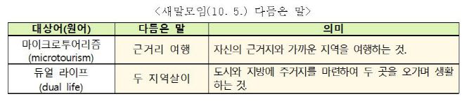 문체부는 또 ‘듀얼 라이프’(dual life) 대체어로 ‘두 지역살이’를 제안했다. 듀얼 라이프는 도시와 지방에 주거지를 마련해 두 곳을 오가며 생활하는 것을 뜻한다.