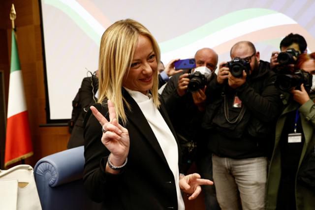 조르자 멜로니 이탈리아형제들(FdI) 대표가 지난 10일 이탈리아 로마에서 열린 신임 FdI 하원의원 모임에 참석해 포즈를 취하고 있다. 로이터 연합뉴스 |