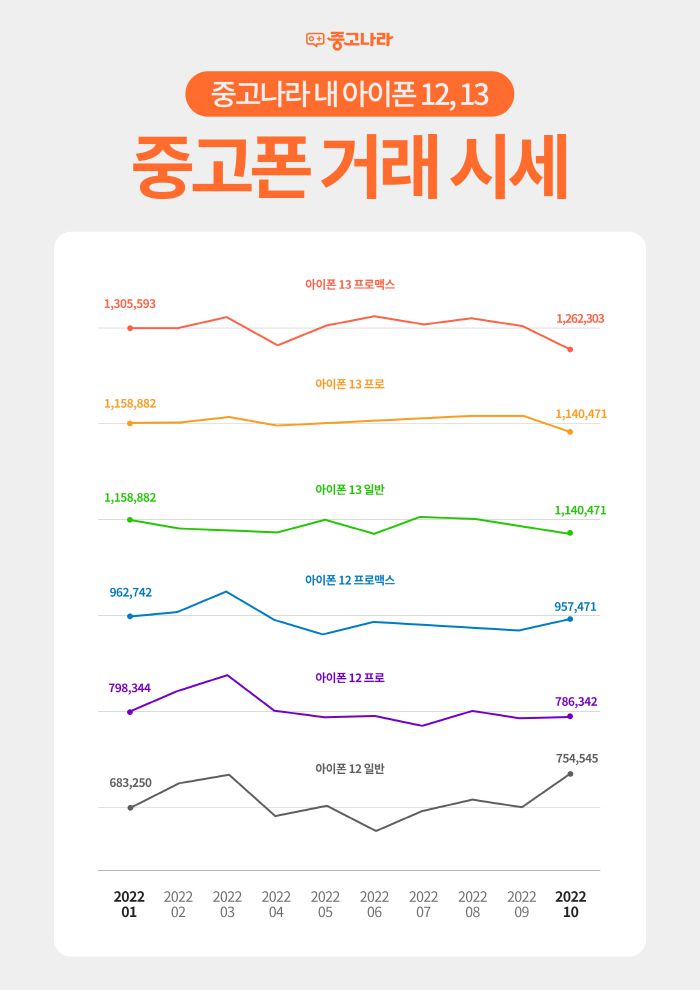 21일 중고나라는 올해 1월부터 10월 중순까지 애플의 플래그십 스마트폰인 아이폰 13 256G (미니, 일반, 프로, 프로맥스)와 아이폰 12 256G (미니, 일반, 프로, 프로맥스) 8종에 대한 중고나라 거래 시세 분석 결과를 공개했다.