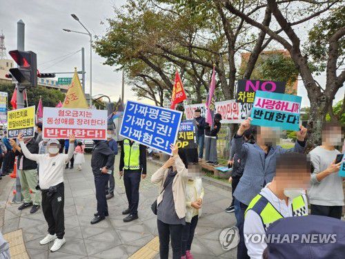 (제주=연합뉴스) 고성식 기자 = 22일 제주시 신산공원 일대에서 제주퀴어문화축제가 열린 가운데 퀴어문화축제 반대 단체들이 항의 시위를 하고 있다. 경찰이 퀴어문화축제 반대단체와의 충돌 등 만일의 사태에 대비해 경비하고 있다. 퀴어문화축제는 LGBT(레즈비언·게이·양성애자·성전환자) 등 성 소수자 인권과 성적 다양성을 알리는 행사다. 2022.10.22