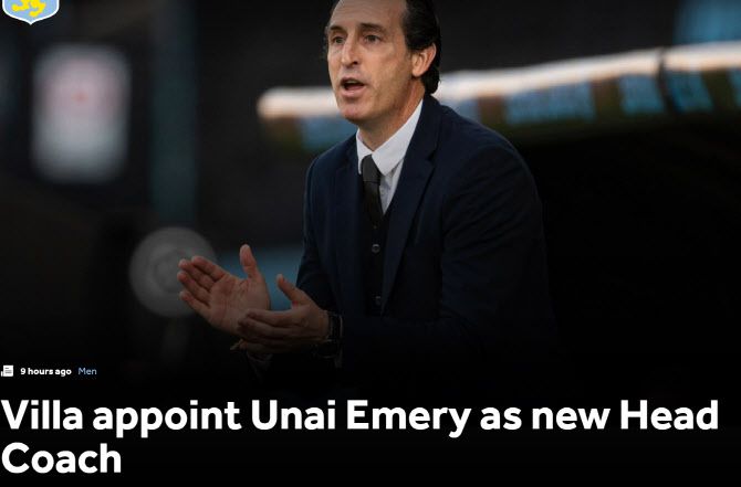 아스톤빌라는 25일(한국시간) 에메리 감독을 새 사령탑으로 선임했다고 공식 발표했다. 에메리 감독이 워크 퍼밋 절차를 마무리하고 다음 달 1일부터 팀을 이끌 예정이다.